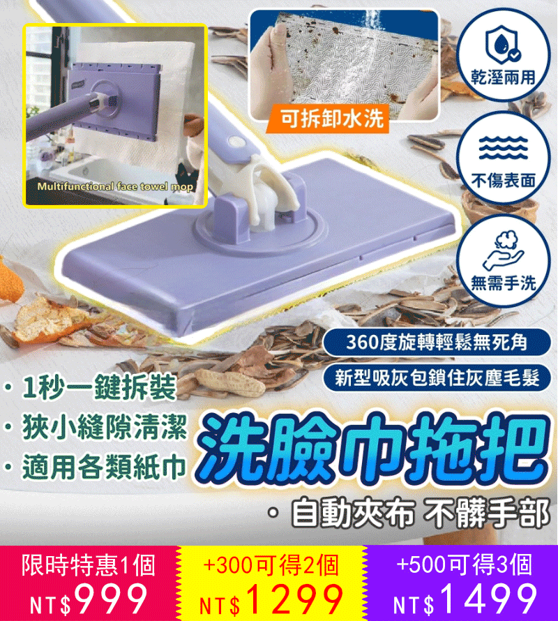 2分鐘前【2024設計獎得獎上新】免手洗懒人伸縮拖把,新升級設計,不在擔心拖把不好弄,新升級長度設計,同時不沾手放人工擰拖把,使打掃變得簡單 - 【今日限定 買一送一 2把+ 拖布*2包 】-NT$999