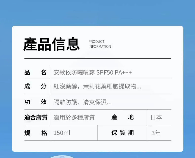 7分鐘前安歌依光圈防曬噴霧,細密噴頭設計 噴頭360°可旋轉自然膚惑,隔離防曬一瓶搞定 - 限時搶購「安歌依光圈防曬噴霧」2入78%用戶的選擇!NT$998【限時免運】