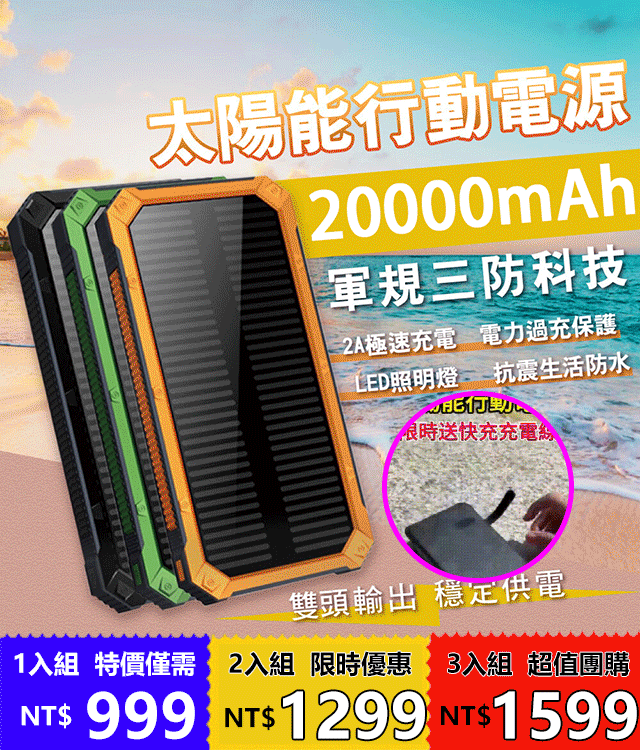 20分鐘前太陽能行動電源 - 【團購優惠】太陽能行動電源3入組僅需-NT$ 1599